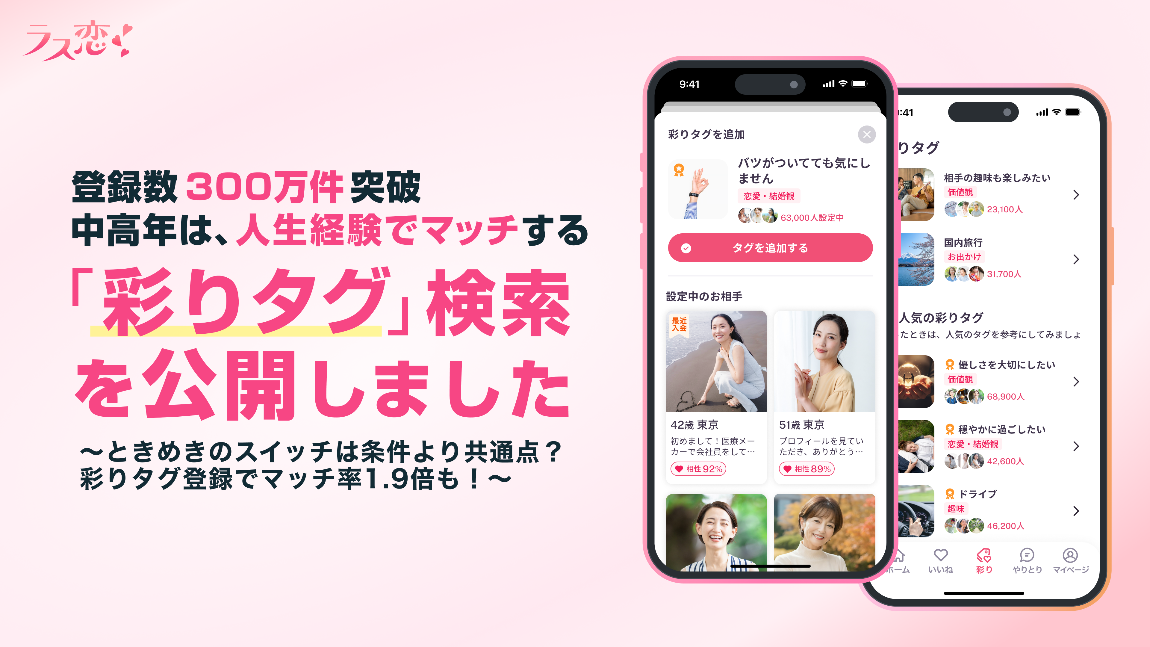 【登録数300万件突破】中高年は、人生経験でマッチする!ラス恋、趣味や価値観を可視化する「彩りタグ」検索を公開!PR TIMES トレンド