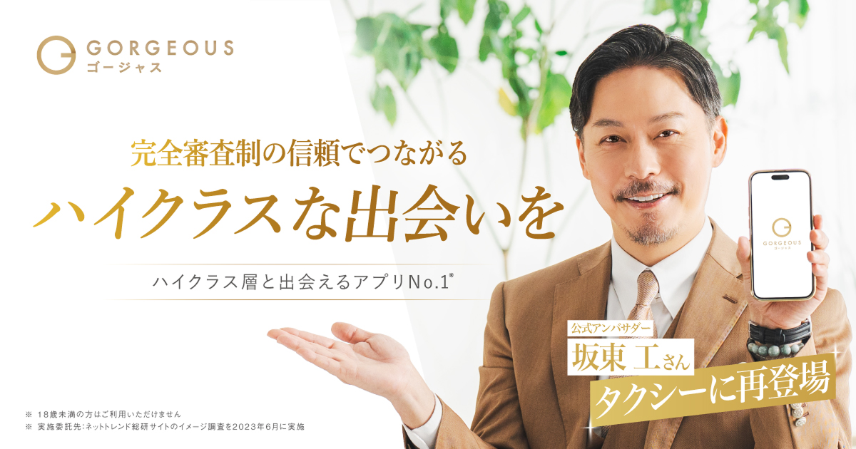 ハイクラスな恋の案内人、再びタクシーに現る。完全審査制恋活・婚活マッチングアプリ「ゴージャス」、公式アンバサダー・坂東工さんとともに届ける第2弾タクシー広告を4月6日より開始!