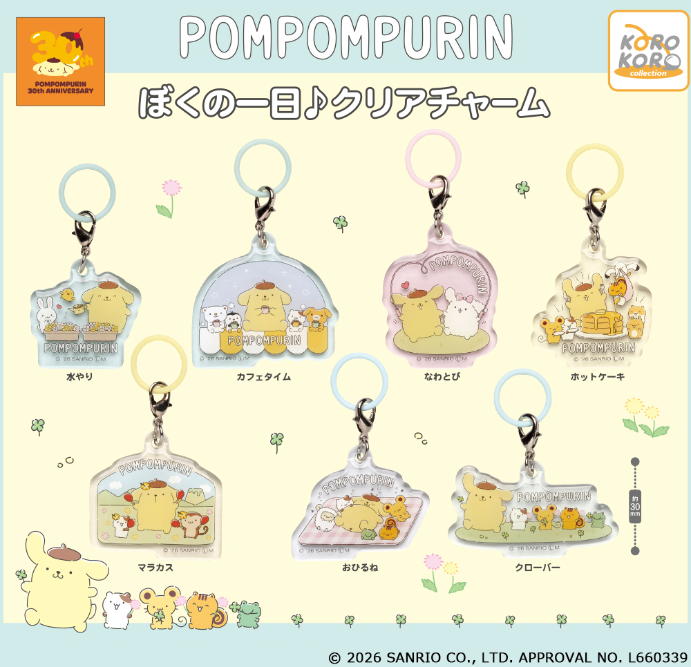 2026年でデビュー30周年!ポムポムプリンがお友だちと過ごす愛しい1日がデザインされた「ぼくの一日♪クリアチャーム」がカプセルトイに登場!