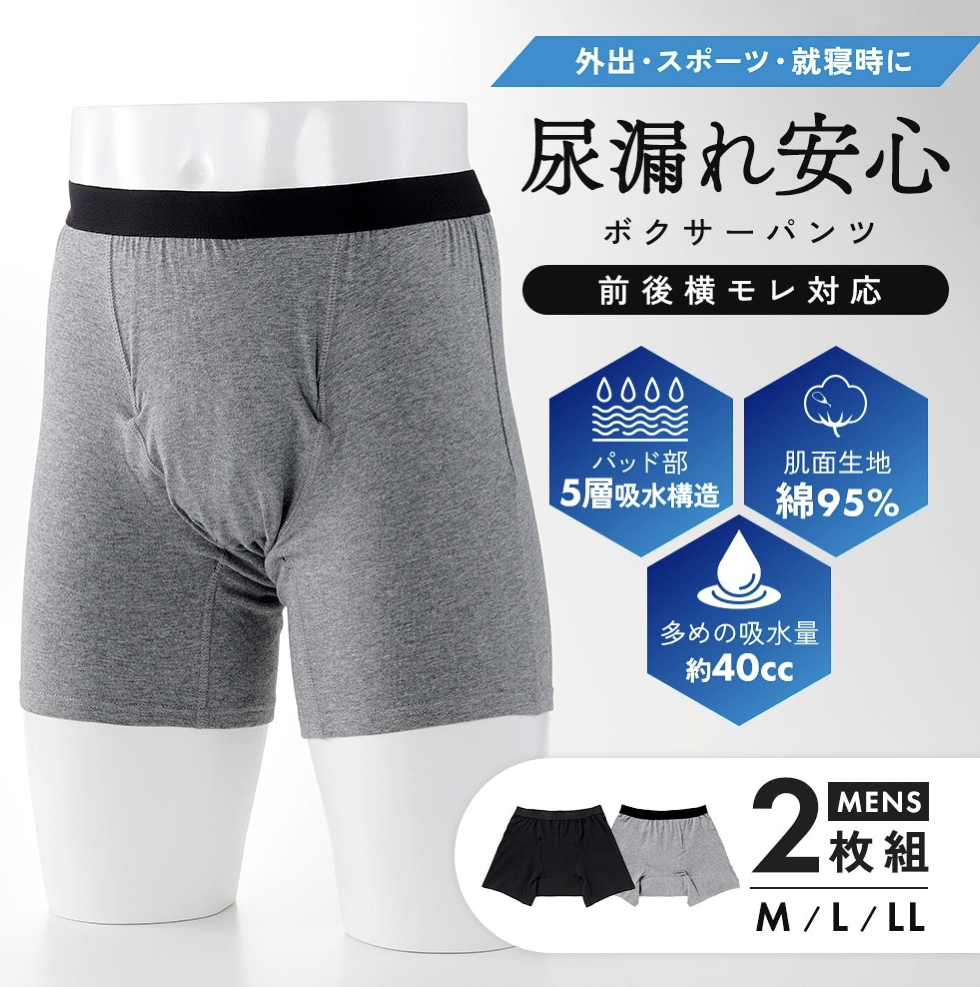 見た目はいつもの下着のまま、 気になる尿モレをしっかりガード!!「尿漏れ安心ボクサーパンツ前後横モレ対応 2枚組」発売中