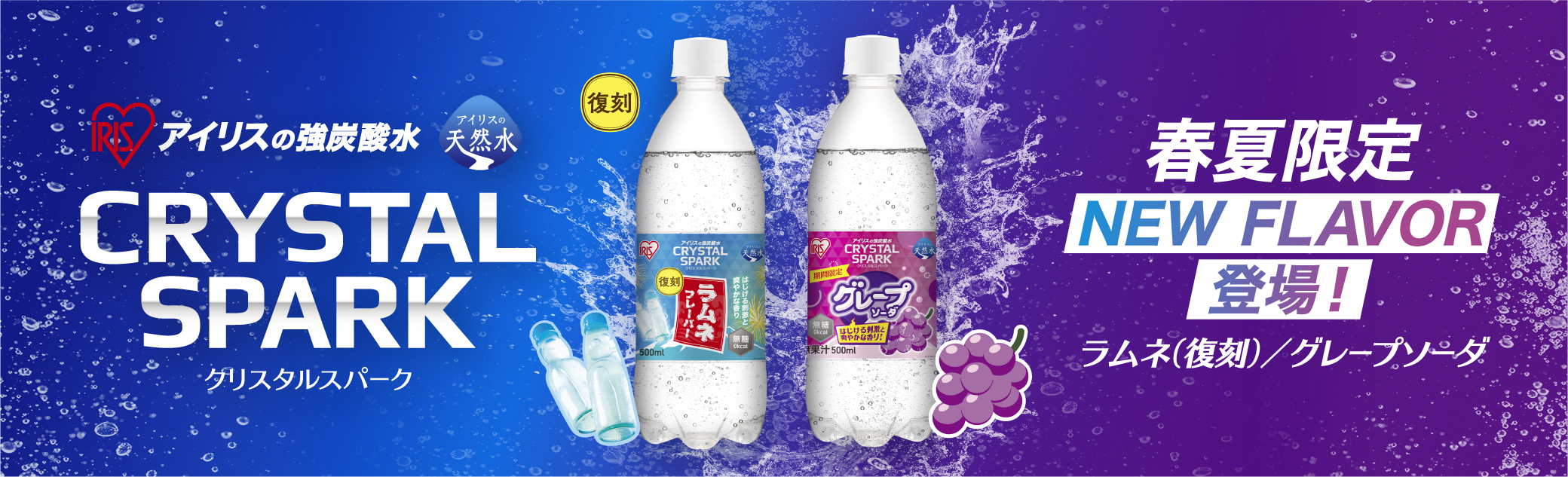 罪悪感ゼロ!無糖の強炭酸「CRYSTAL SPARK」シリーズから春夏限定フレーバー「グレープソーダ」を新発売!歴代限定フレーバー人気No.1「ラムネ」が再登場、通年発売開始!