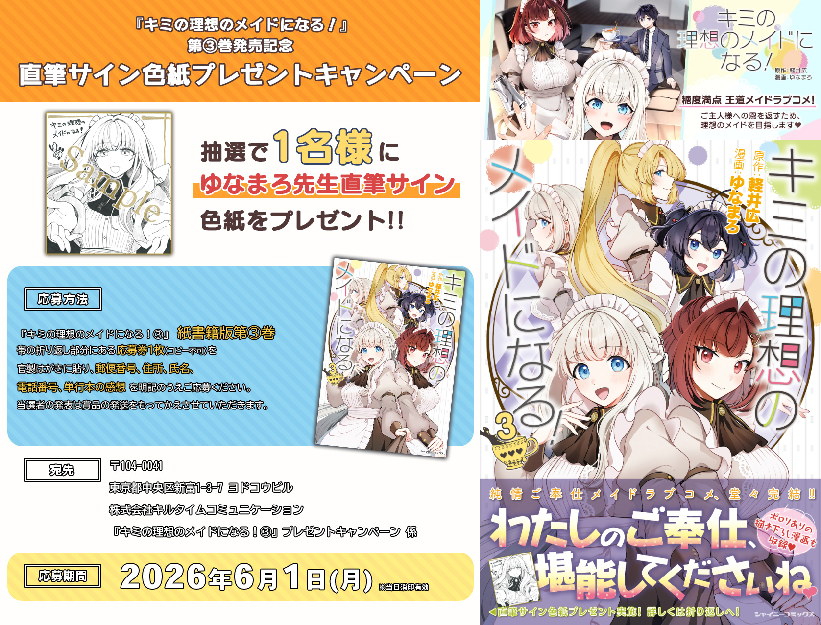 シャイニーコミックス『キミの理想のメイドになる!3』発売記念【ゆなまろ先生直筆サイン色紙プレゼントキャンペーン】開催!ぼっちな御曹司とメイド達の甘~いご奉仕メイドラブコメ最終巻!