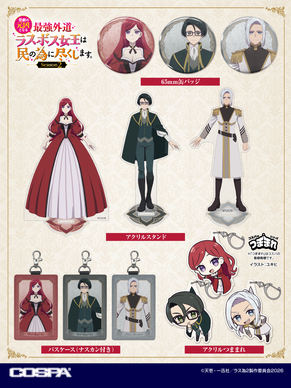 TVアニメ『悲劇の元凶となる最強外道ラスボス女王は民の為に尽くします。Season2』より、「プライド」たちのアクリルスタンドや、缶バッジ、つままれなどが新登場!【株式会社コスパ】