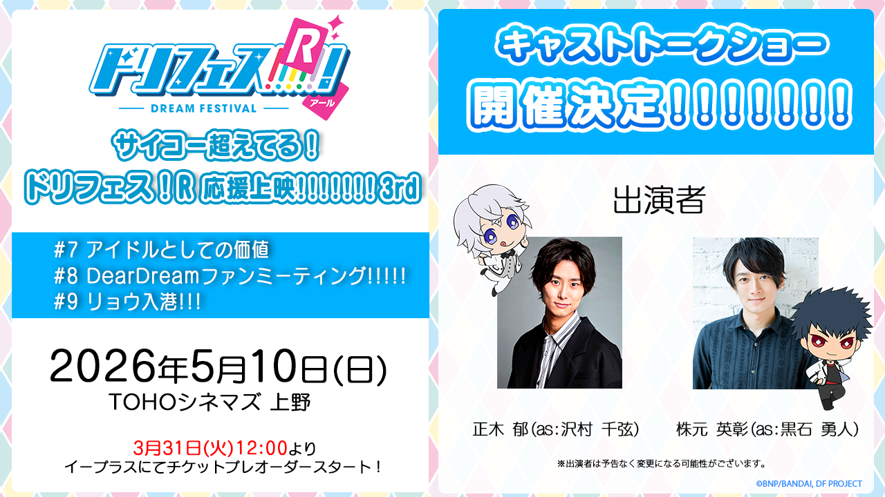 アニメ『ドリフェス!R』声出しOK応援上映第3弾「サイコー超えてる!ドリフェス!R 応援上映!!!!!!! 3rd」が5月10日(日)TOHOシネマズ 上野にて開催決定!
