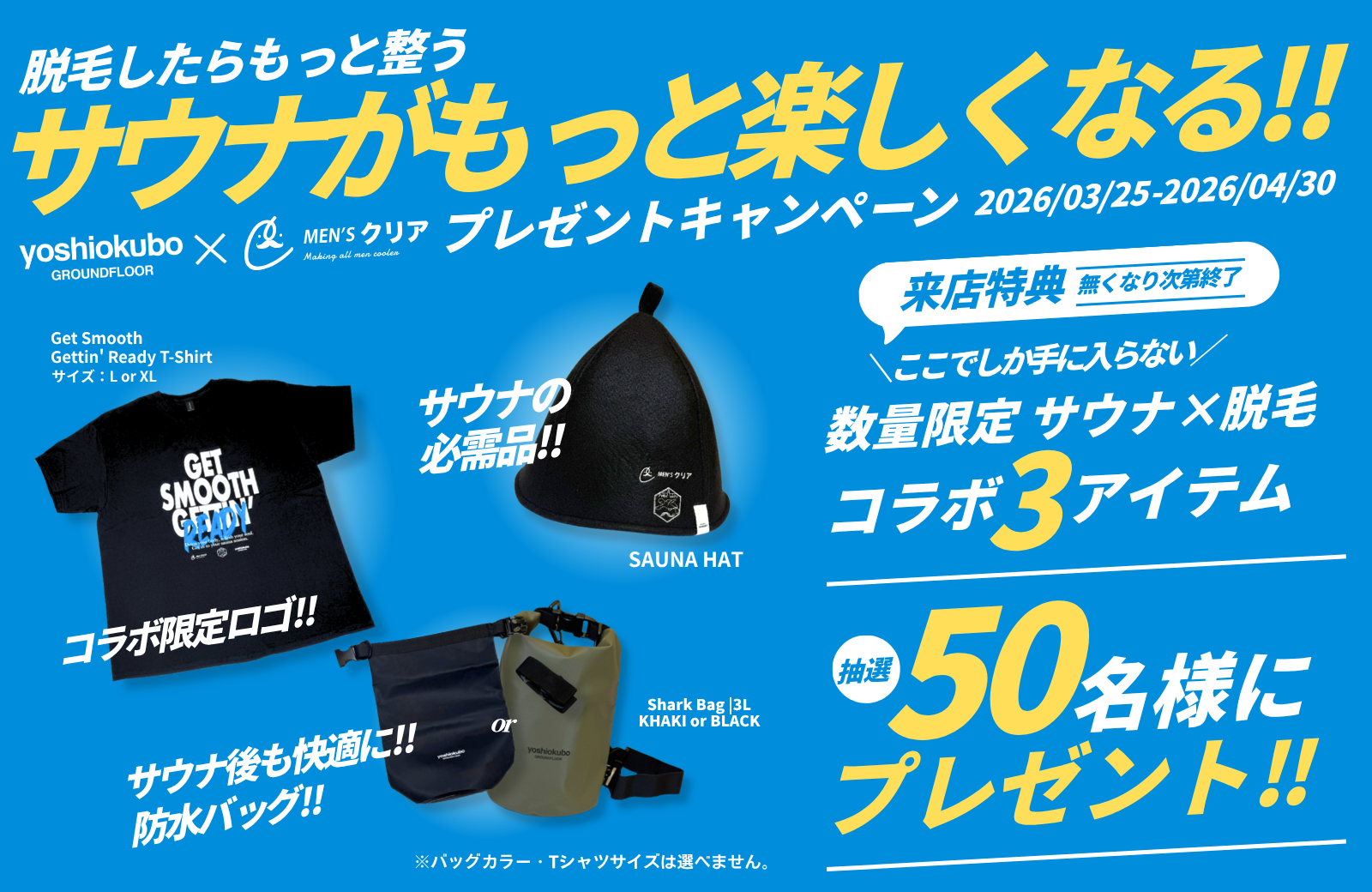 【サウナ好き必見!!】yoshiokubo×メンズ脱毛サロン「メンズクリア」コラボサウナグッズが当たるキャンペーンを開催