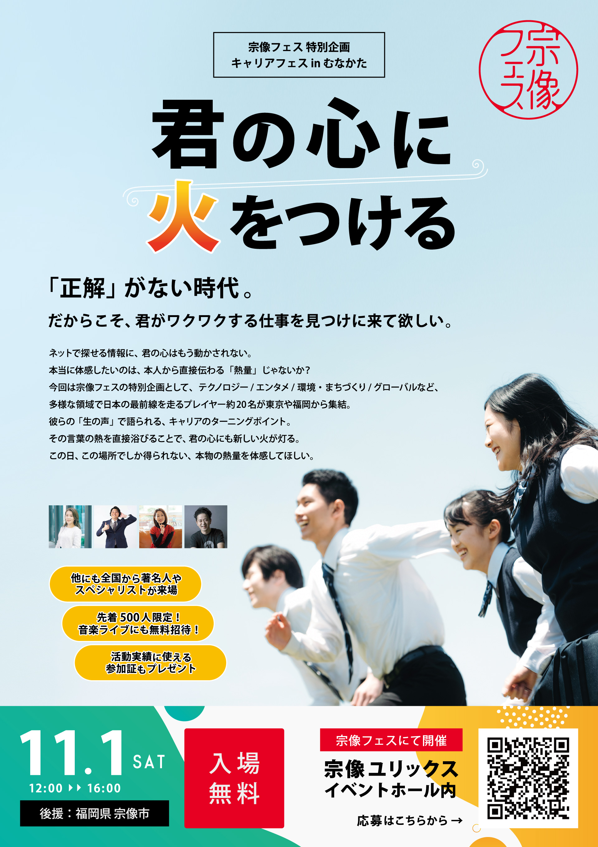 宗像フェス 学生向け特別企画 キャリアフェス in むなかた 11月1日開催!「君の心に火をつける」全国から著名人やスペシャリストがキャリアフェスに集結!先着500名様には音楽ライブにも無料招待★