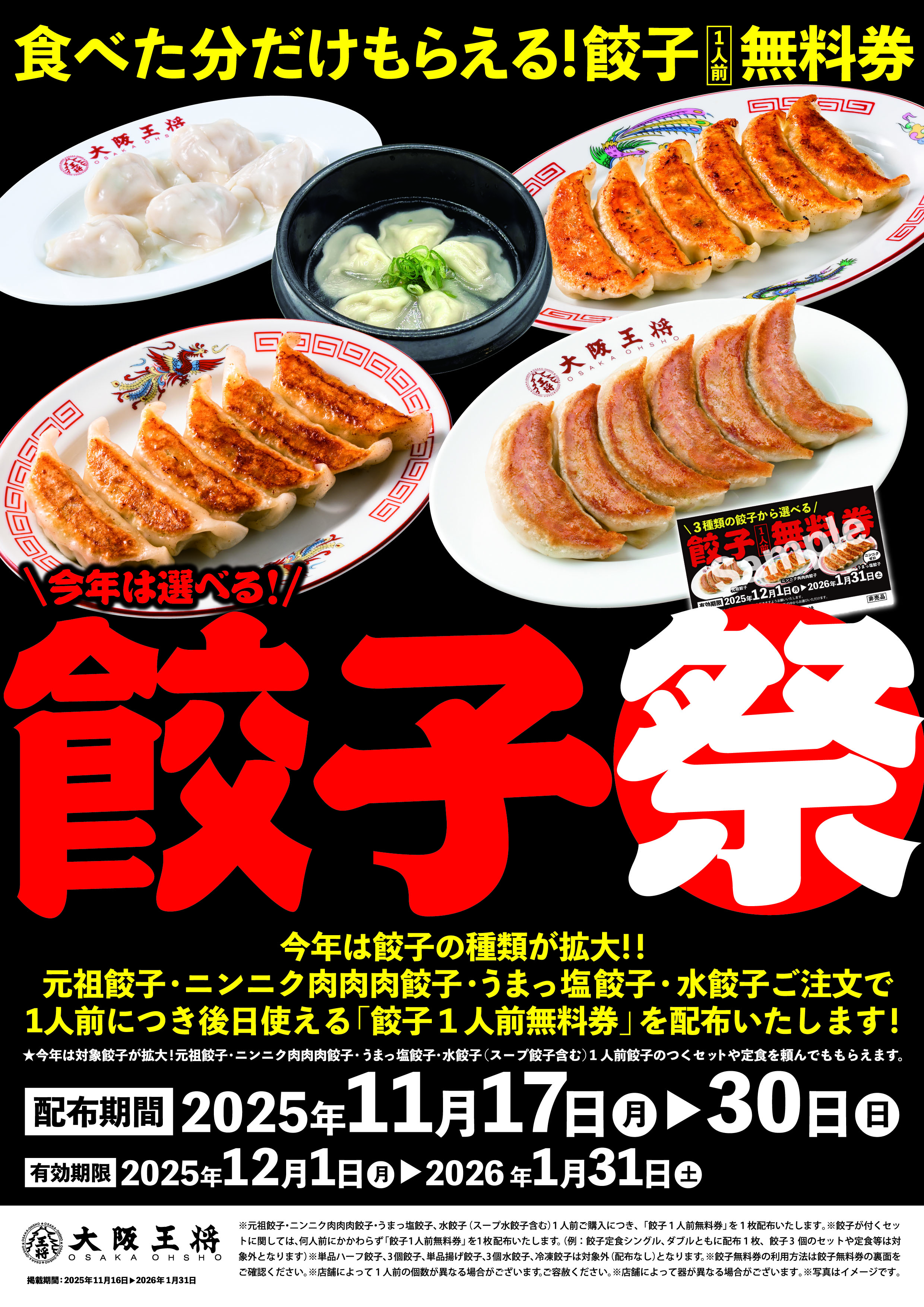 毎年恒例!大阪王将・餃子祭が11/17スタート!食べた分だけ“必ず”もらえる餃子無料券プレゼント