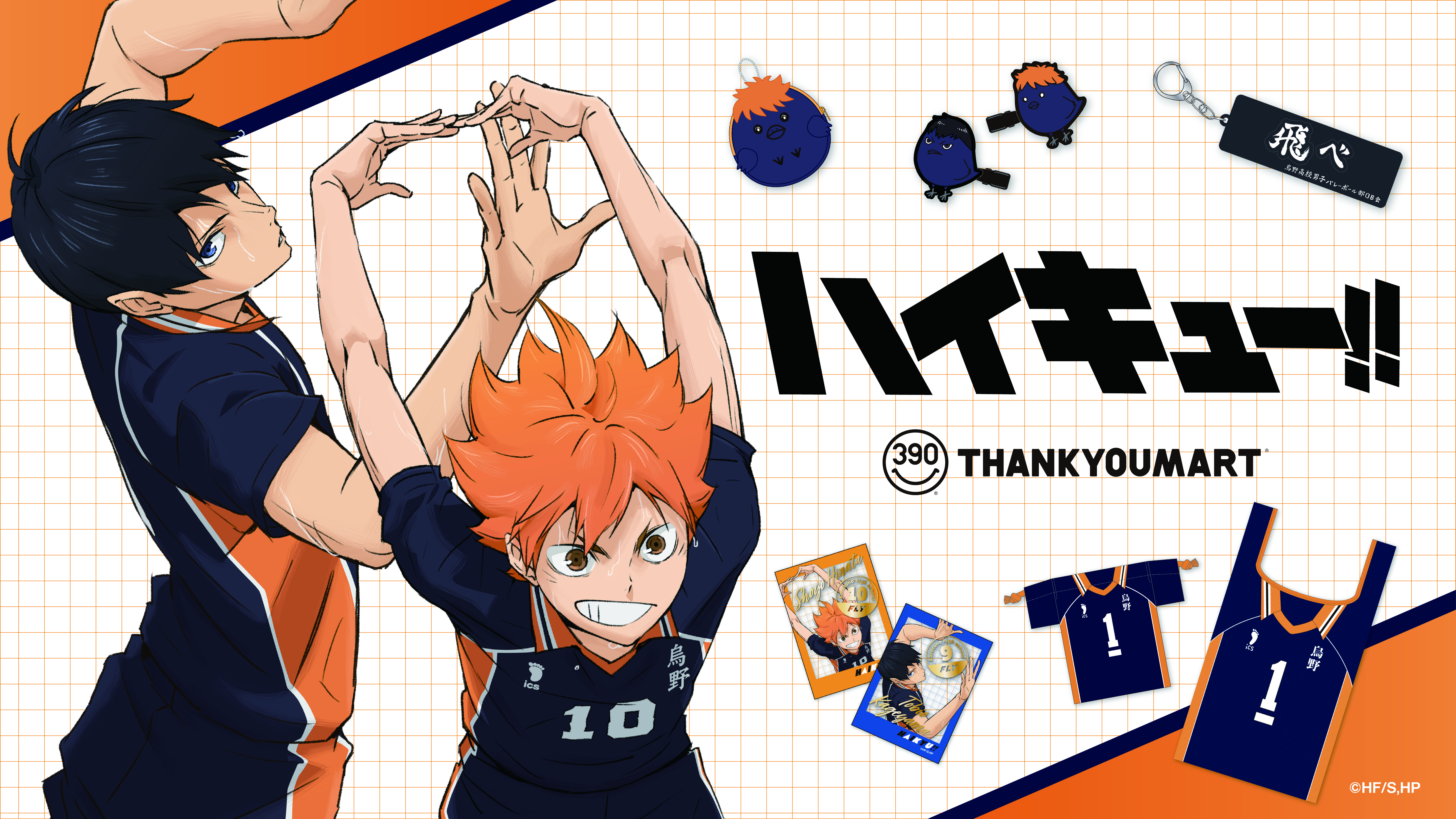 アニメ「ハイキュー!!」の限定アイテムが全品390円(税込429円)でサンキューマートから新発売!ユニフォームデザインや「アニマルマスコット」「しまだマート」の人気モチーフも登場