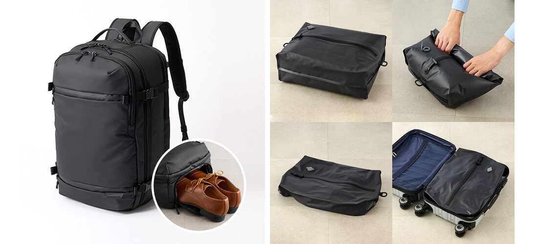 出張や旅行に役立つトラベル用品がエレコムから!専用の独立ポケットで靴を気持ちよく運べるバックパックとかさばる衣類をすっきりまとめる圧縮袋を新発売