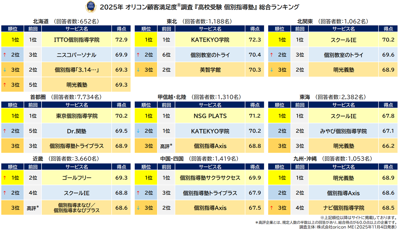 満足度の高い『高校受験 個別指導塾』ランキング『東海』【スクールIE】が5年連続8度目の総合1位『九州・沖縄』【明光義塾】が7年連続の総合1位に(オリコン顧客満足度(R)調査)