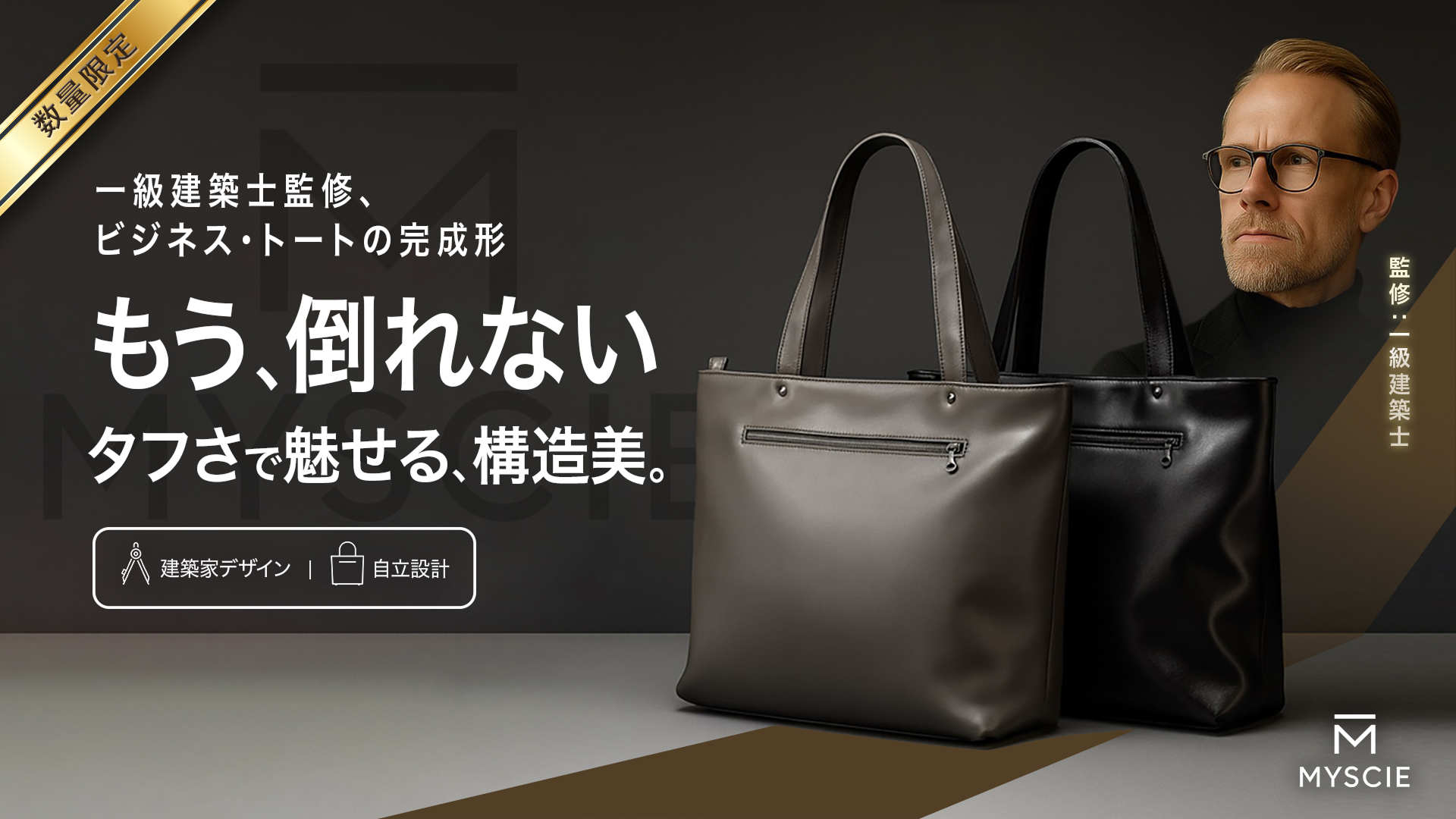 【先着600名 30%OFF枠を公開通知で確保】床置きでも“もう、倒れない”。一級建築士監修の“構造美ビジネスバッグ”『MYSCIE 次世代タフトート』がMakuakeに登場