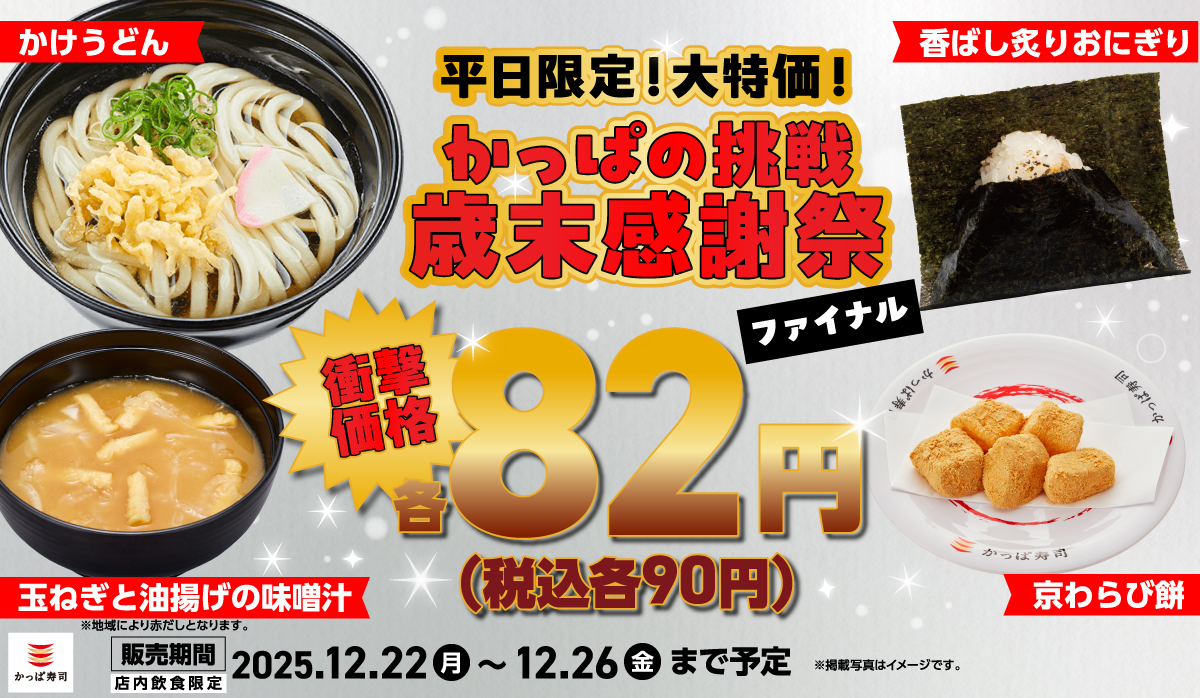 【かっぱ寿司】「味噌汁」「京わらび餅」を衝撃価格で価格凍結宣言!12月22日(月)~平日限定!大特価!かっぱの挑戦 歳末感謝祭“ファイナル”を開催!