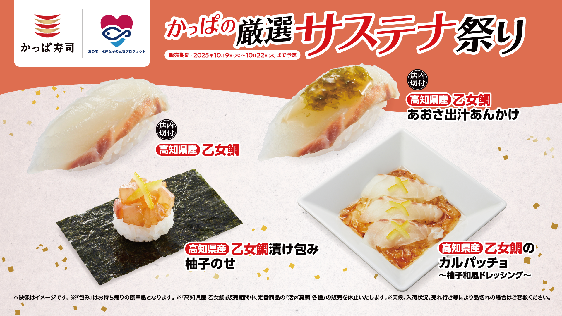 【かっぱ寿司×海の宝!水産女子の元気プロジェクト】高知県の豊かな海で丁寧に育てられた“桜色の美しい真鯛”『高知県産 乙女鯛』が、全国のかっぱ寿司で1皿110円(税込)~楽しめる!