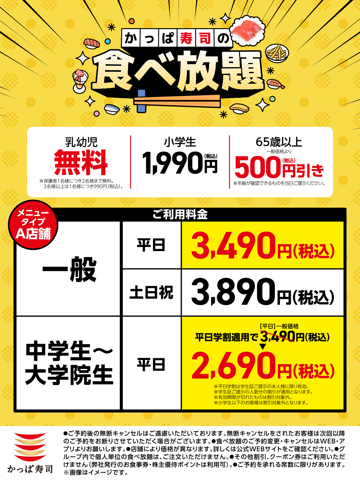 大好評!幼児無料の食べ放題4月15日(水)まで全店延長決定!春休み、卒業・入学祝いに!平日価格・学生割引も継続で学生は平日お得な税込2,690円~!※1事前予約制、店舗により当日予約、当日受入も可※2