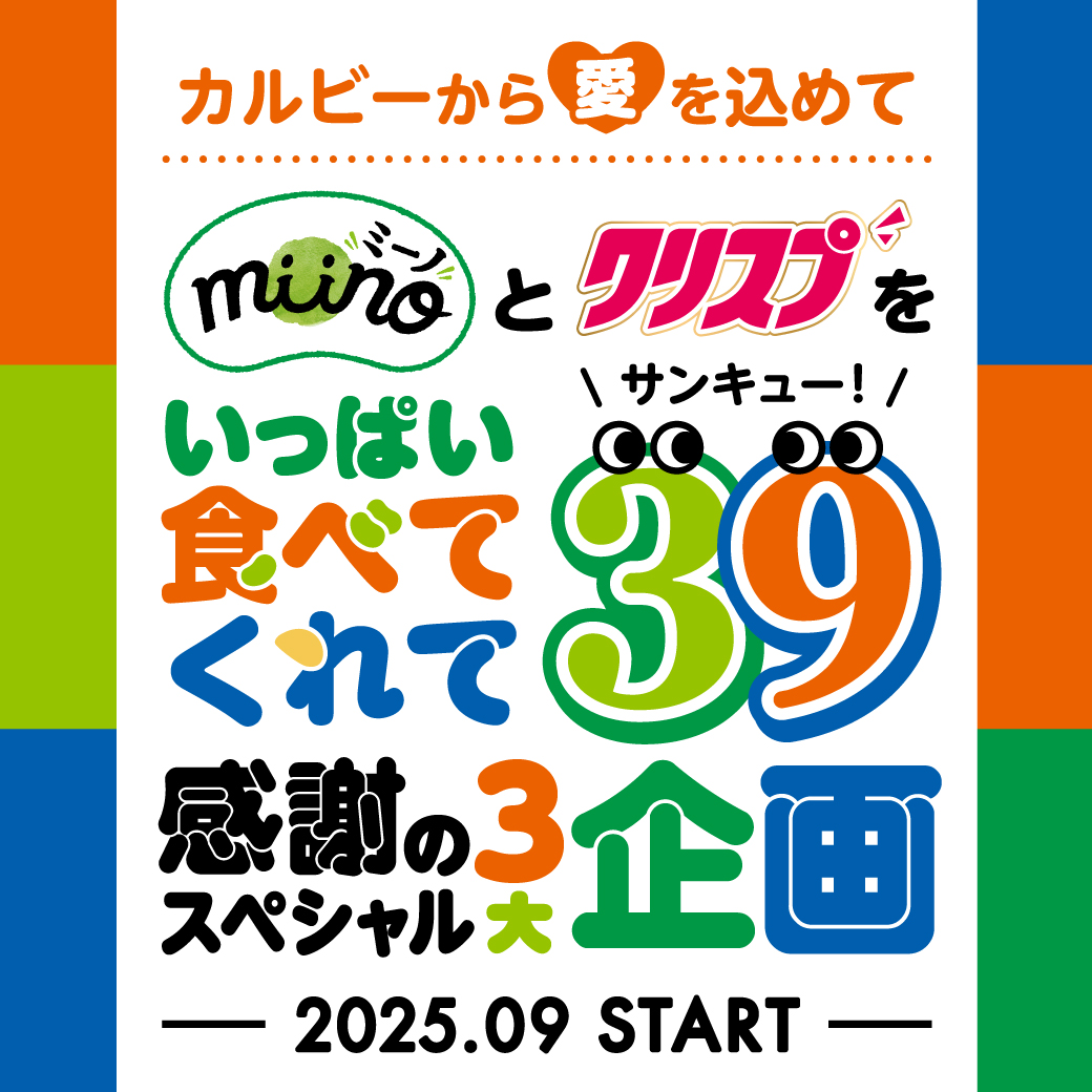 「miino(ミーノ)」と「クリスプ」が初タッグでお客様へ感謝を伝える『ミーノとクリスプをいっぱい食べてくれてサンキュー企画』2025年9月19日(金)より順次スタート