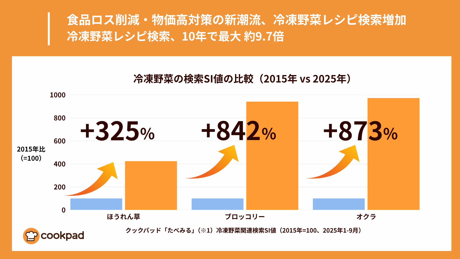食品ロス削減・物価高対策の新潮流、冷凍野菜レシピ検索、10年で最大約9.7倍|クックパッド