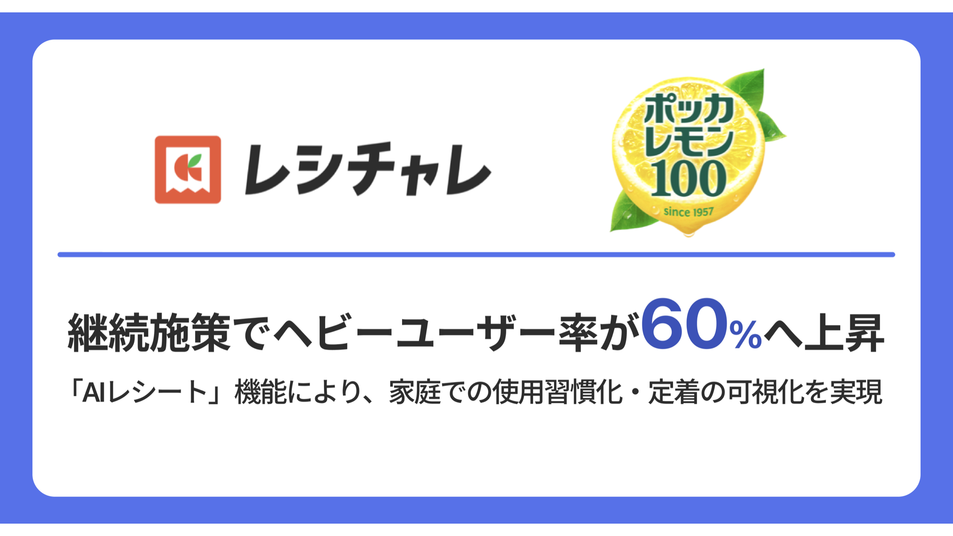 【継続施策でヘビーユーザー率が60%へ上昇】「レシチャレ」の「AIレシート」機能により、「ポッカレモン100」の使用習慣化・定着の可視化を実現