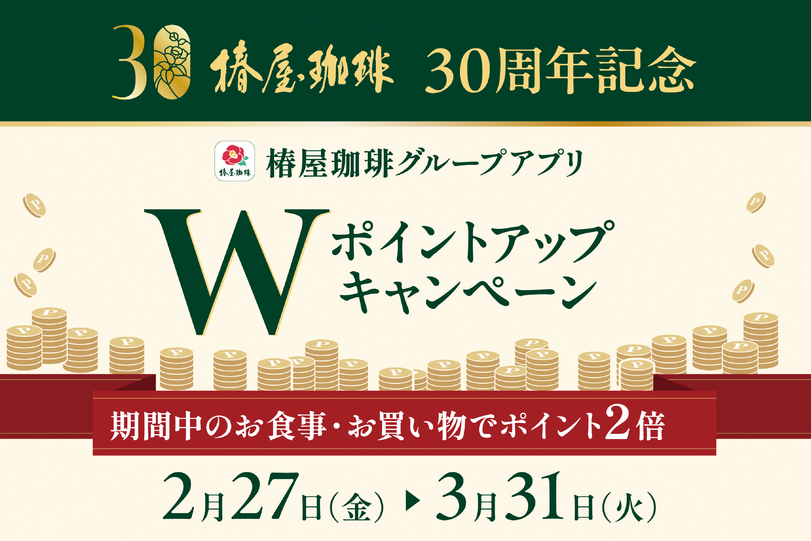 「椿屋珈琲グループアプリ」Wポイントアップキャンペーンを開催!