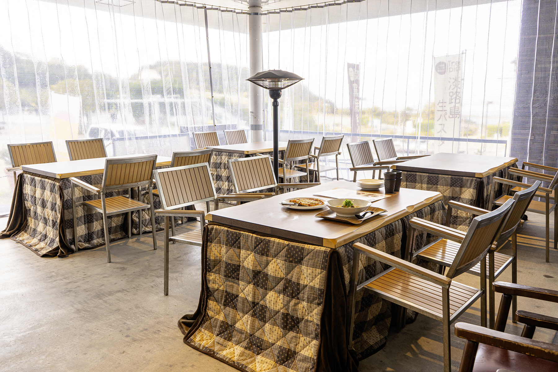 【淡路ハイウェイオアシスで、冬の新しい楽しみ方】淡路島生パスタ「ピチ」と窯焼きピザ専門店「Trepici(トレピチ)」の屋外テラスに、こたつ席新設!