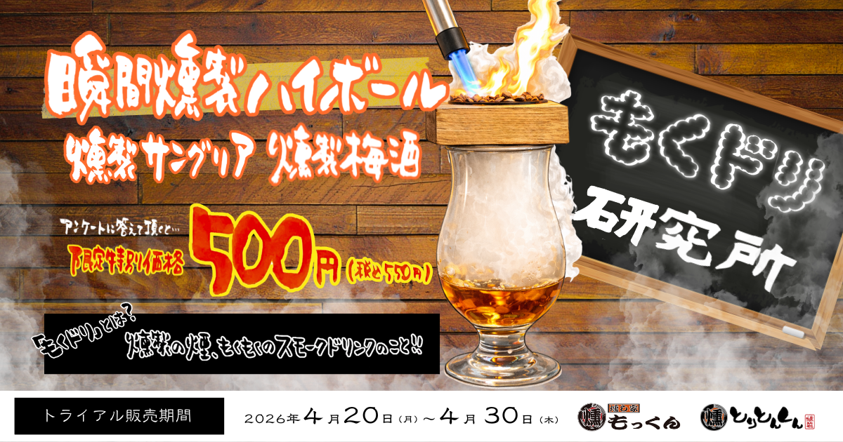 【燻製ドリンクを限定販売】燻し家もっくん・とりとんくんが『もくドリ研究所』を発足し、トライアルキャンペーンを開催!