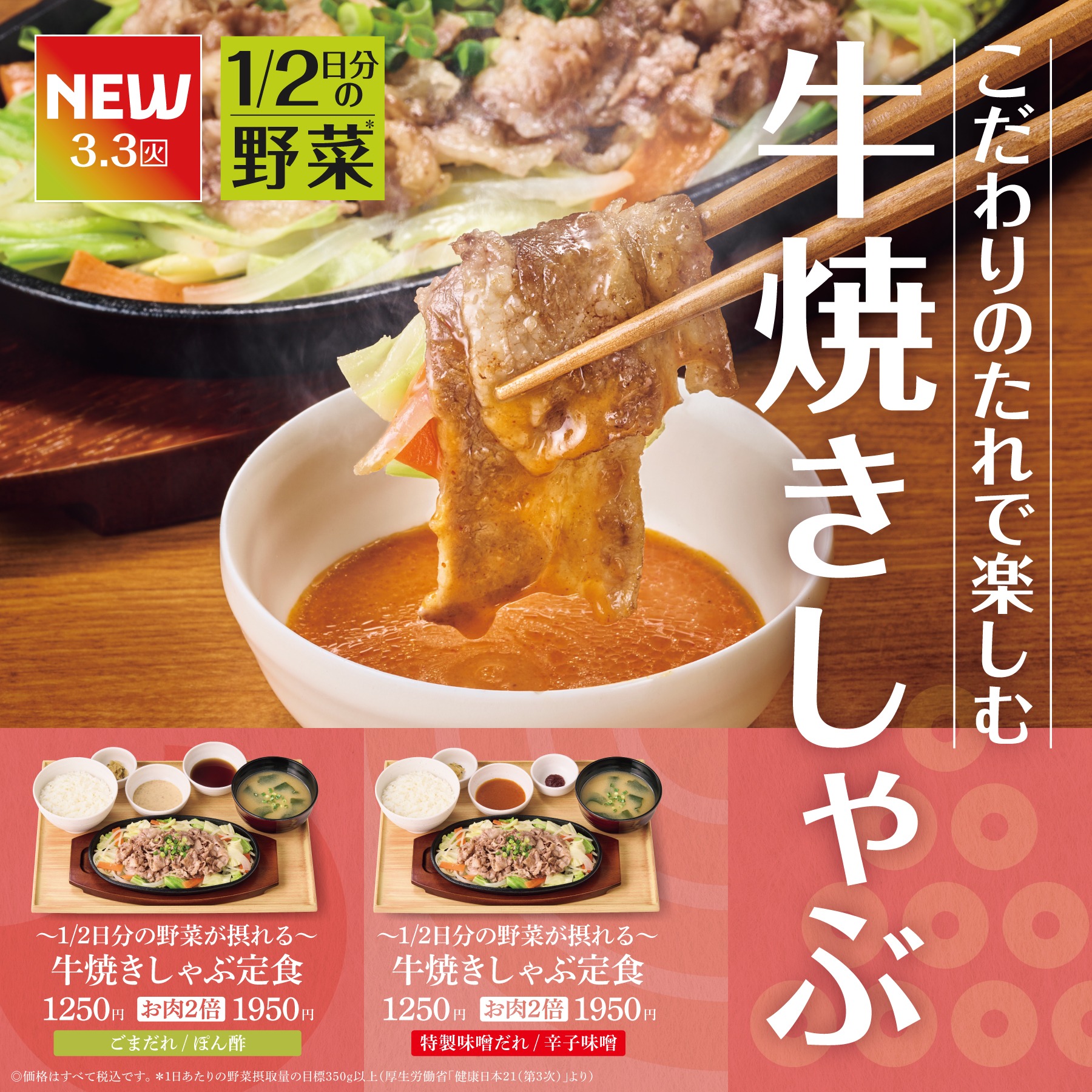「やよい軒」選べるこだわりの“たれ”で食べる『~1/2日分の野菜※が摂れる~牛焼きしゃぶ定食』発売