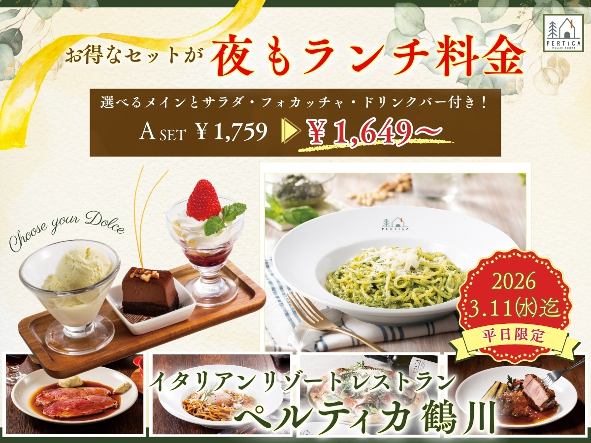 【イタリアン リゾート ペルティカ 鶴川】平日はお得なセットが“夜もランチ料金”でお楽しみいただけます!ぜひこの機会に五感をくすぐるイタリアンでお得に至福のディナーをお楽しみください。