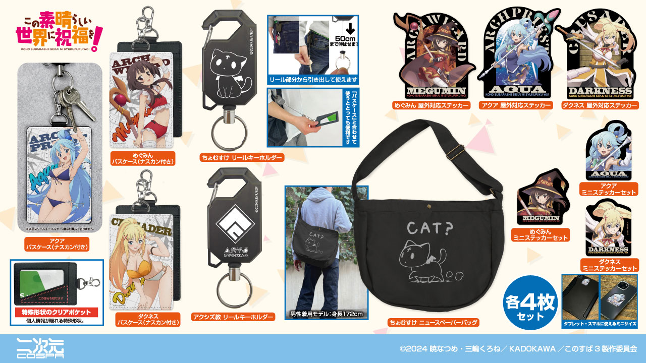 二次元コスパより、アニメ『この素晴らしい世界に祝福を!』アクアやめぐみん、ダクネスたちの「パスケース」,「ちょむすけ ニュースペーパーバッグ」など新グッズが登場【株式会社コスパ】