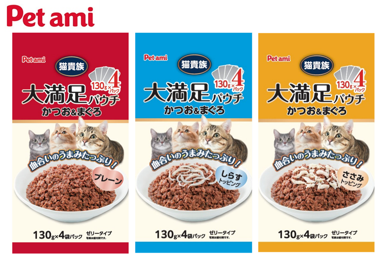 大満足容量のお買い得レトルトパウチ「Pet ami 猫貴族 かつお&まぐろ 大満足パウチ130g×4袋パック」