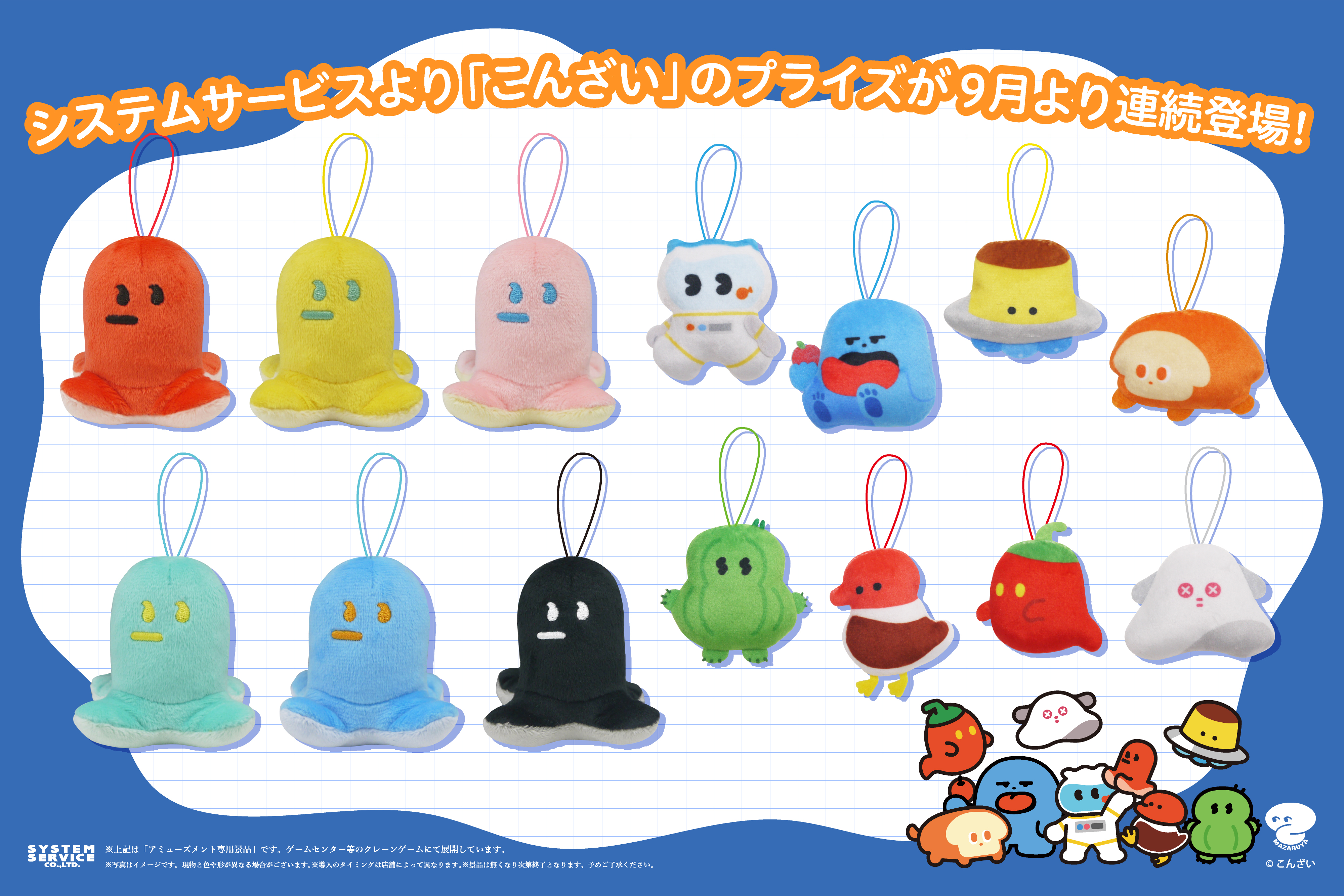 システムサービスから「こんざい」のプライズが2025年9月よりゲームセンターなどに登場!