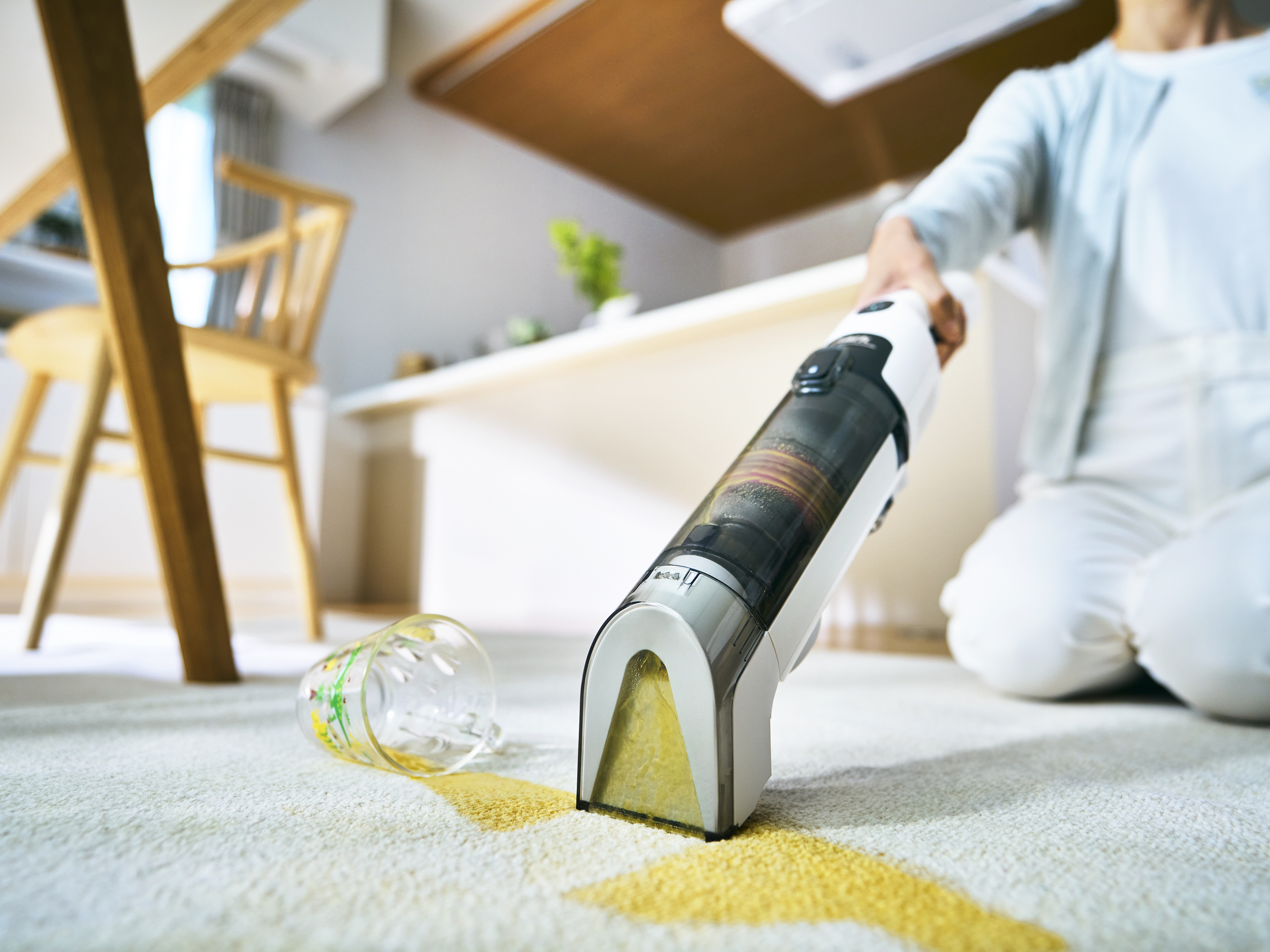 「あっ!」と思った瞬間 強力吸引で、サッとシミ取り。液体汚れに サッと使えるコードレスハンディ型シミ取りクリーナー「Shark(R) StainForce コードレスシミ取りクリーナー」新発売