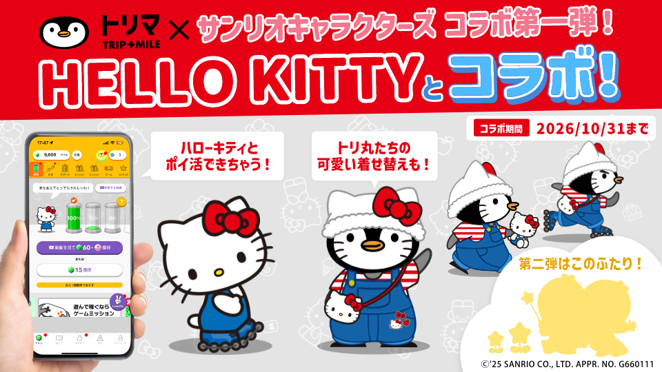 移動でポイントが貯まるアプリ「トリマ」、サンリオキャラクターズとのコラボレーション企画を開始