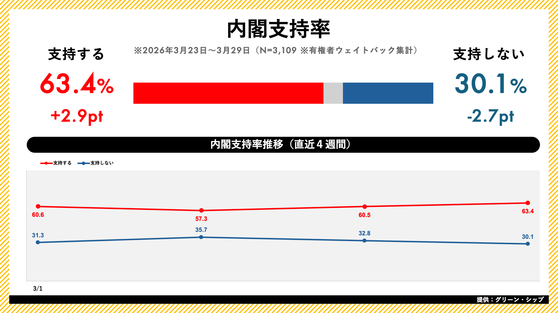 日次世論調査「世論レーダー」週次集計(3月第5週)を公開|高市内閣支持率63.4%(前週比+2.9pt)、自民党支持率は31.4%で微増