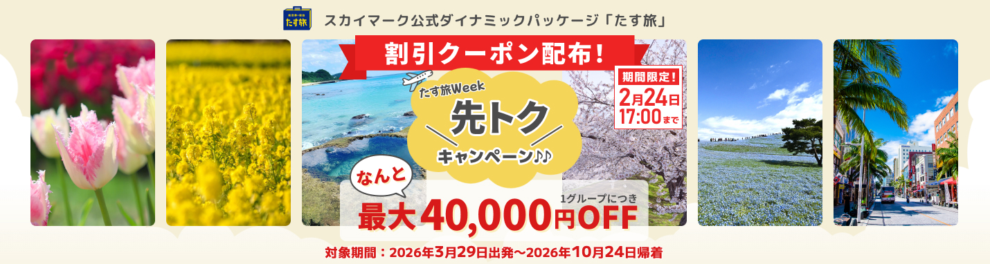 【最大40,000円OFF♪先トクキャンペーン実施中】スカイマーク公式ダイナミックパッケージ『たす旅・先トクキャンペーン♪』で最大4万円OFFクーポンを配布!GW・夏休みなど人気の日程は早い者勝ち!