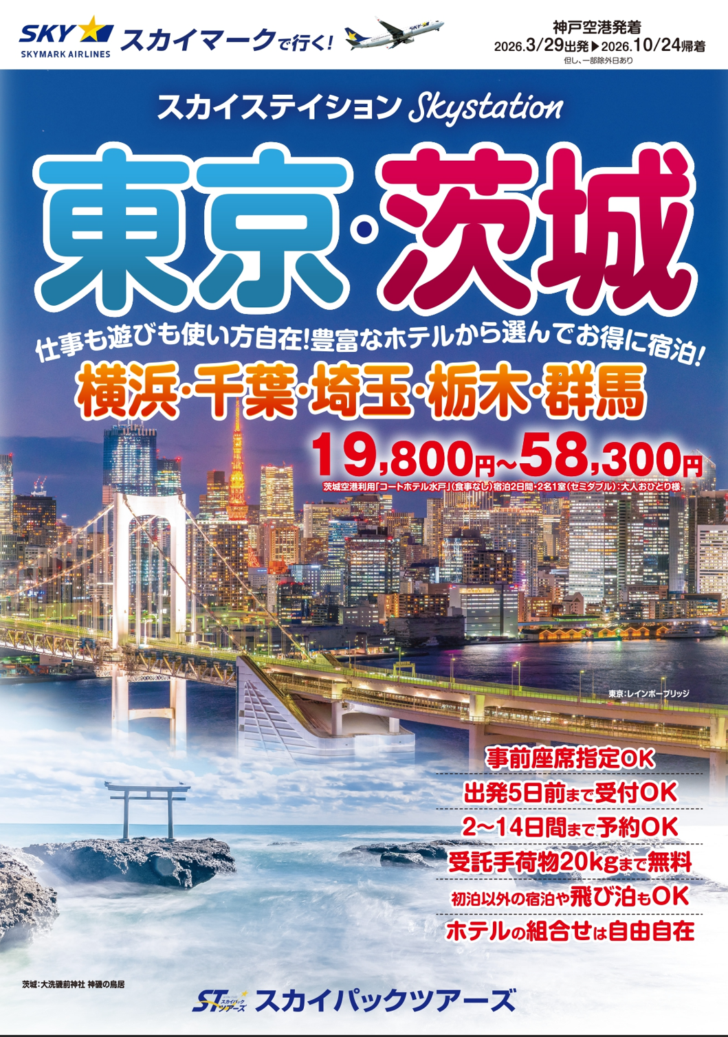 【新商品/神戸空港発着】スカイマークで行く「スカイステイション 東京・茨城」を販売開始!19,800円からのスペシャルプライス♪スカイマーク公式ダイナミックパッケージ『たす旅』ではクーポンセール実施中