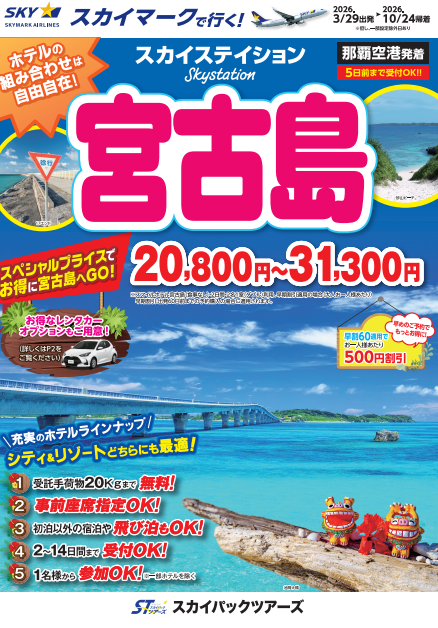 【新商品/福岡空港発着】スカイマークで行く!「スカイステイション 宮古島」を販売開始!29,800円からのスペシャルプライス♪スカイマーク公式ダイナミックパッケージ『たす旅』ではクーポンセール 実施中