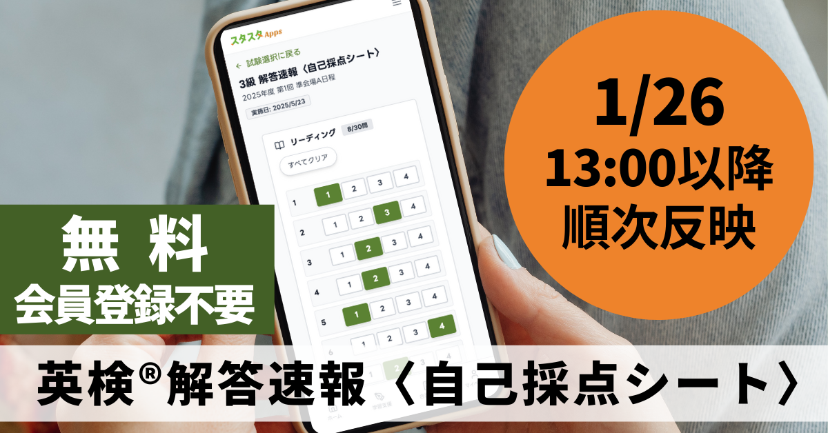 英検(R)解答速報公開(1/26 13:00以降)に合わせ、スタスタAppsが自己採点シートを順次反映