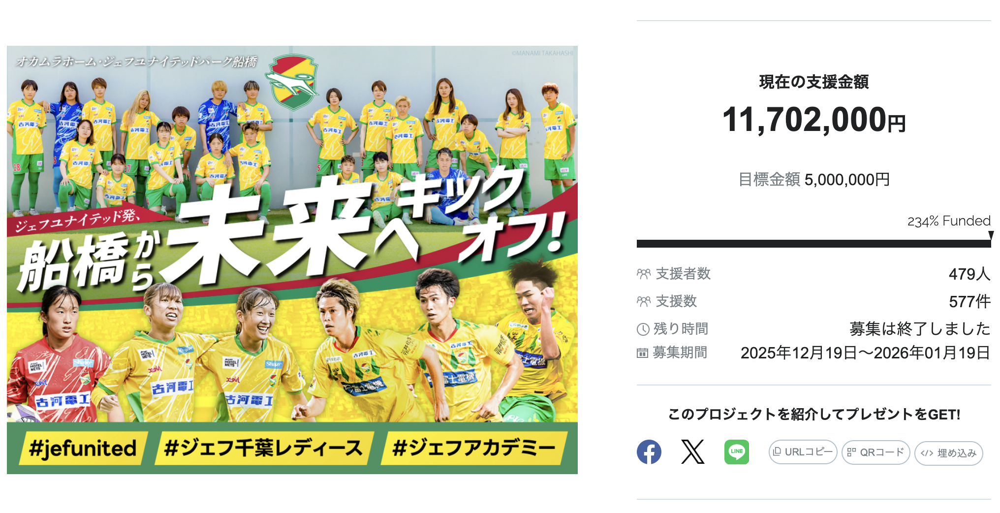 ジェフユナイテッド市原・千葉、クラウドファンディング「ジェフユナイテッド発、船橋から未来へキックオフ」、目標達成率234%にて終了!