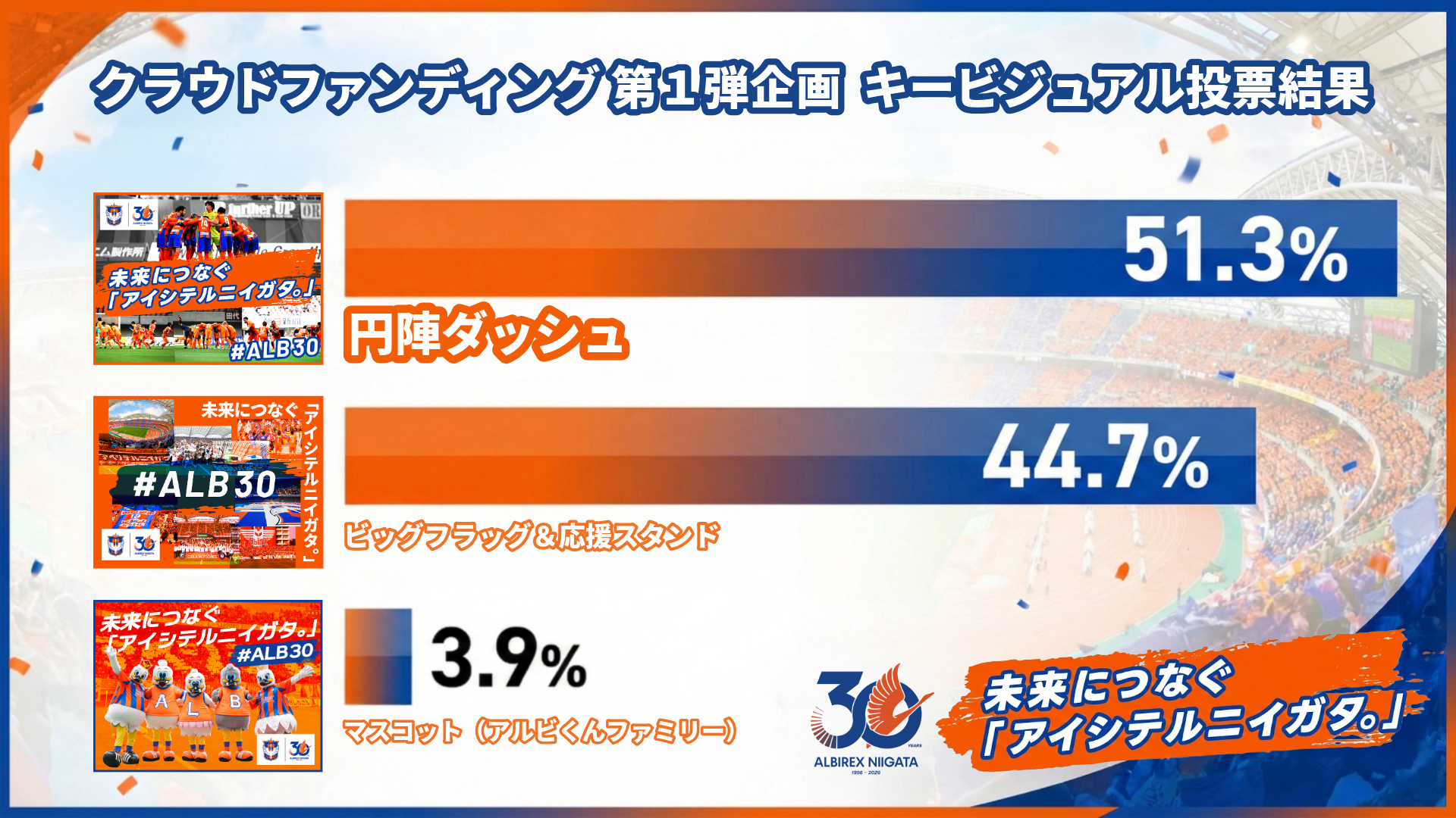 アルビレックス新潟、クラウドファンディング『未来につなぐ「アイシテルニイガタ。」 #ALB30』において、「ともにつくり上げる30周年企画」第二弾として返礼品のアンケート募集開始!