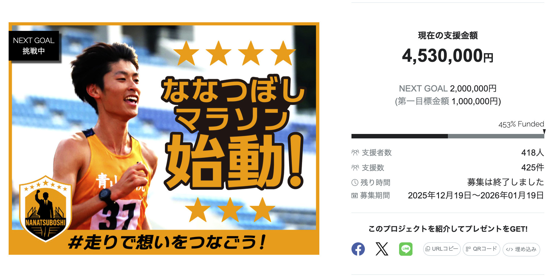 クラウドファンディング「ななつぼしマラソン始動。#走りで想いをつなごう!」目標達成にて終了!