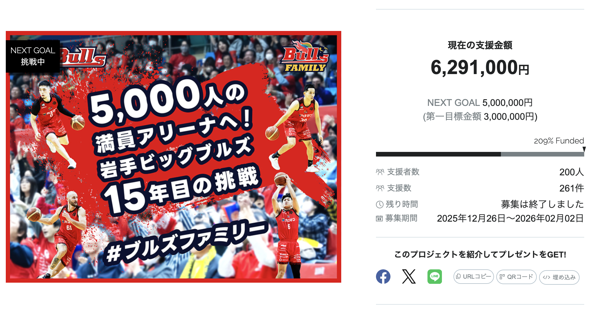 【目標達成!】【600万円以上】岩手ビッグブルズ、クラウドファンディング「5,000人の満員アリーナへ!岩手ビッグブルズ15年目の挑戦 #ブルズファミリー」、目標達成率209%!