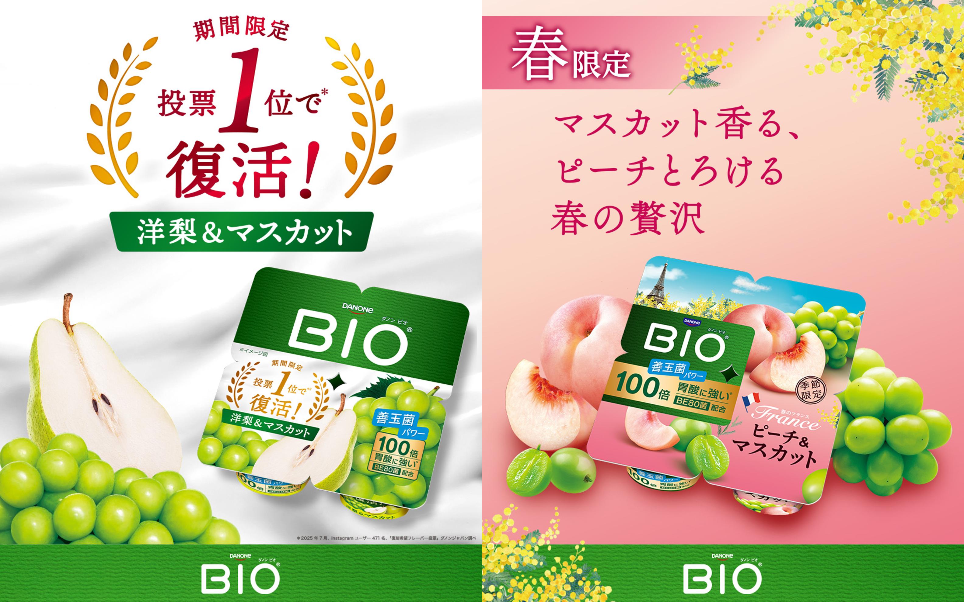 ダノン ビオ(R)から春の新作2品が登場!「世界旅行」シリーズ第5弾・フランス編「ピーチ&マスカット」と、復活投票1位「洋梨&マスカット」を2月16日発売