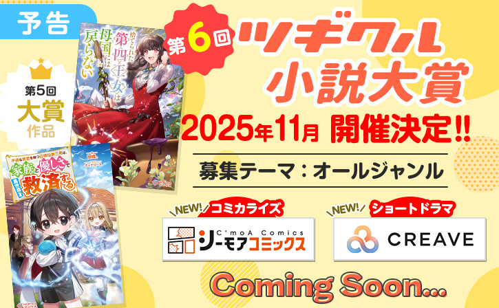 WEBコンテンツポータルサイトのツギクル、業界トップクラスの電子書籍レーベル「シーモアコミックス」とショートドラマの企画・制作を手掛ける「CREAVE」による「第6回ツギクル小説大賞」開催決定!