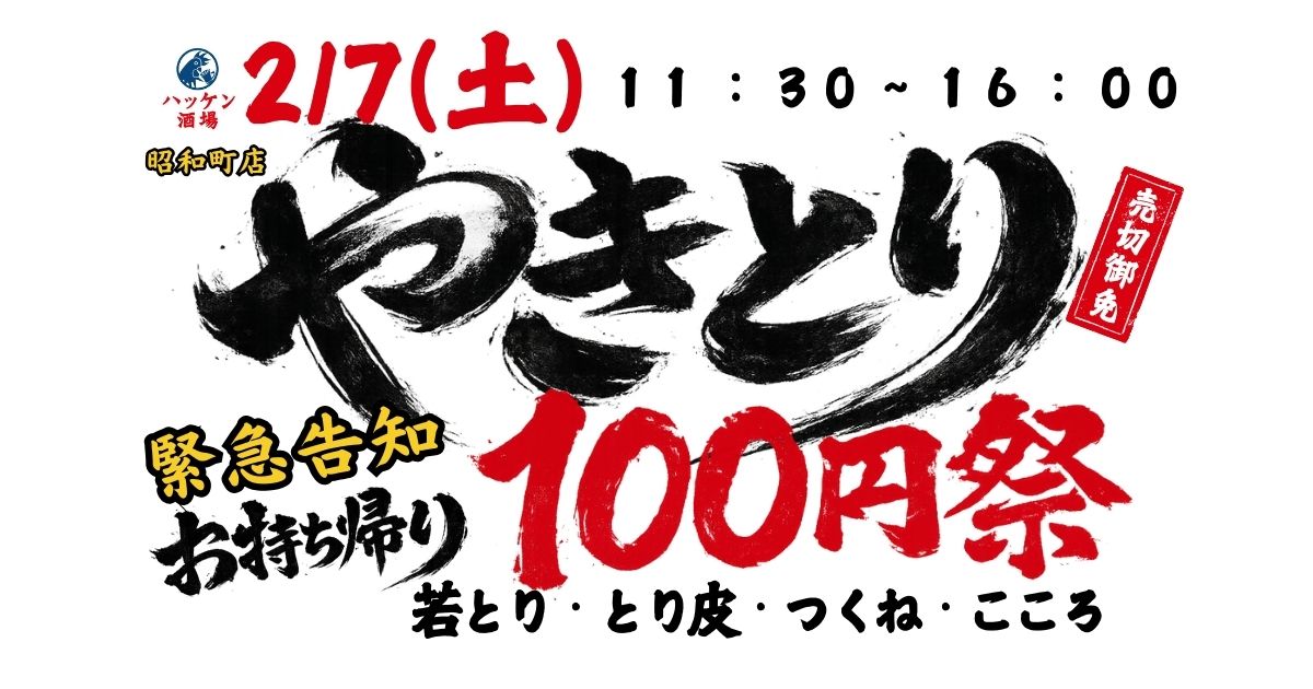 【ハッケン酒場 昭和町店】2月7日(土)限定!衝撃!!名物やきとり「1,500本」!お持ち帰り100円祭