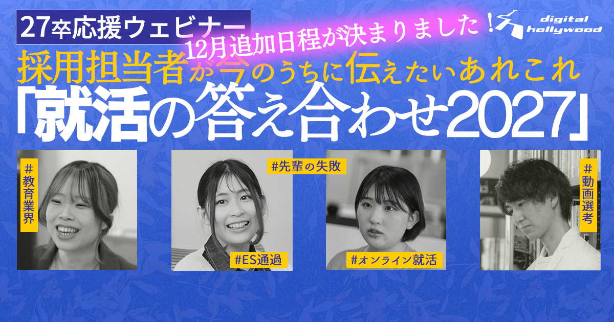 【12月の開催日程が決定】27卒応援ウェビナーしくじり就活・元社員登壇・動画選考解説「就活の答え合わせ2027」