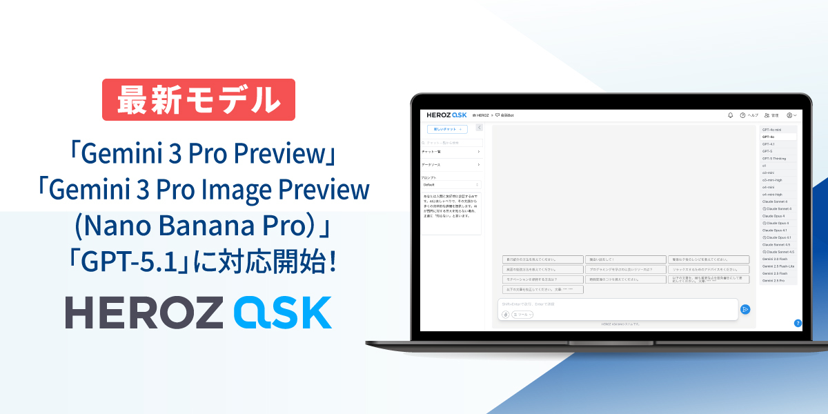 法人向けAI SaaS「HEROZ ASK」、Gemini 3 Pro Preview、Gemini 3 Pro Image Preview(Nano Banana Pro)及びGPT-5.1に対応!
