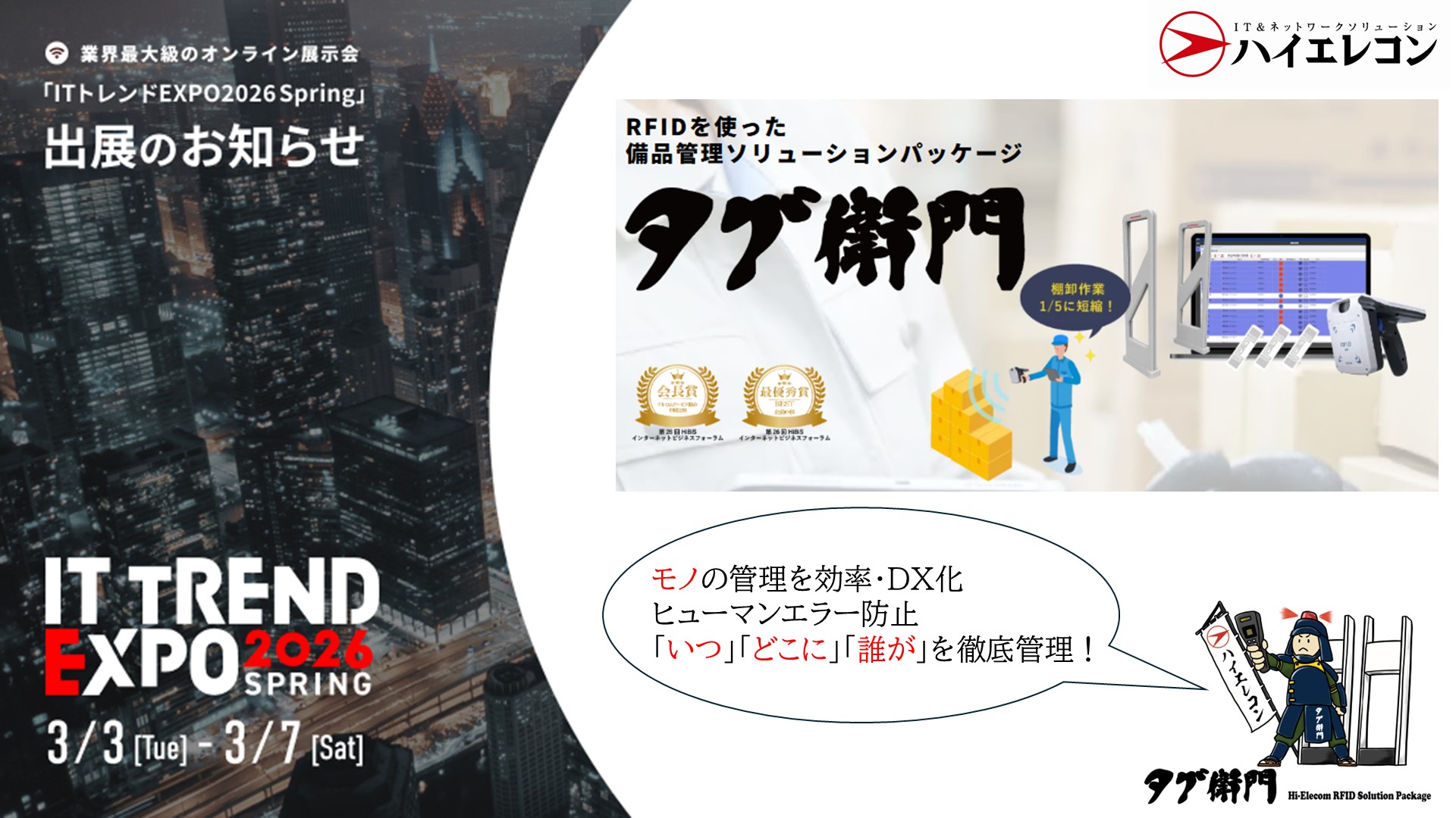 『タグ衛門』がITトレンドEXPO2026 Springに出展!RFIDでモノ管理をスマートにするハイエレコンの最新ソリューションを、業界最大級のオンライン展示会でご体験ください!