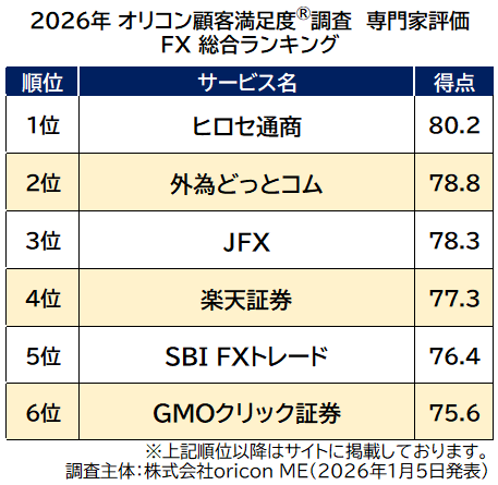 \利用者5,700人が評価した/ 満足度の高い【FX】 2026年オリコン顧客満足度(R)調査| 【JFX】(2年連続)と【ヒロセ通商】(通算10度目)が同点で総合1位に