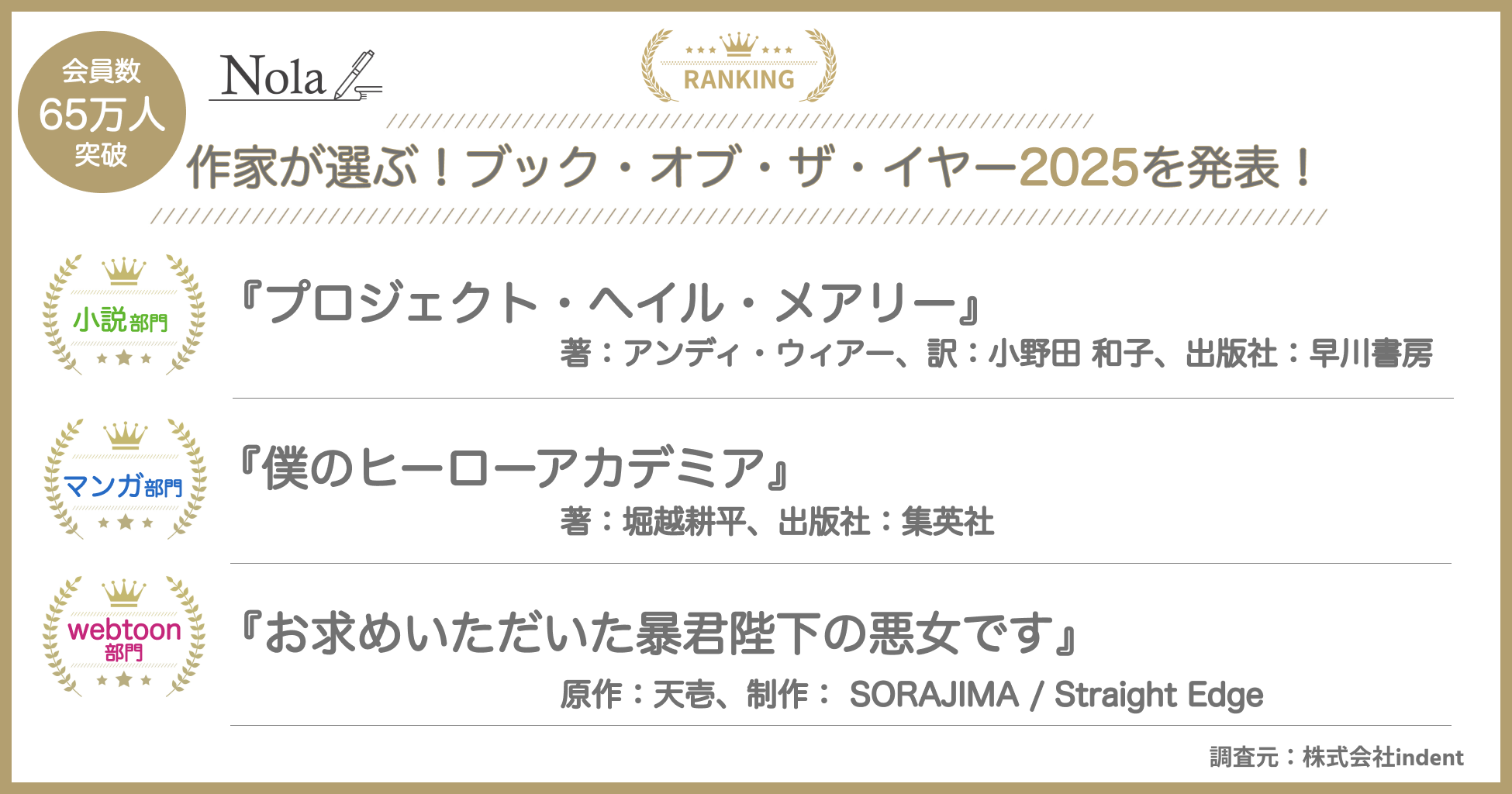 <65万人を超える作家が登録する創作プラットフォーム「Nola」主催>『作家が選ぶ!ブック・オブ・ザ・イヤー2025』を発表!