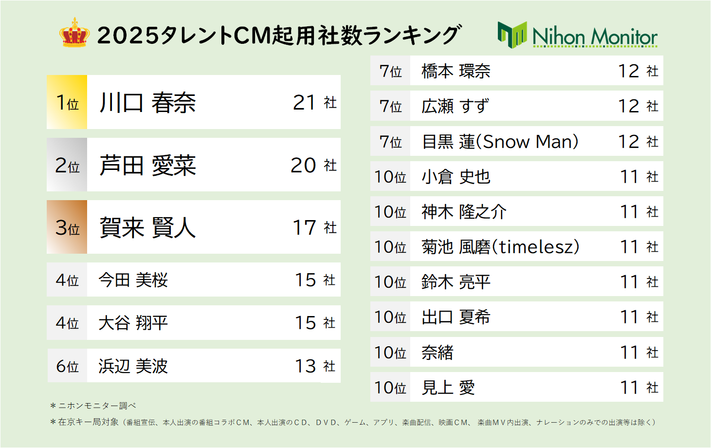 ニホンモニター2025タレントCM起用社数ランキング