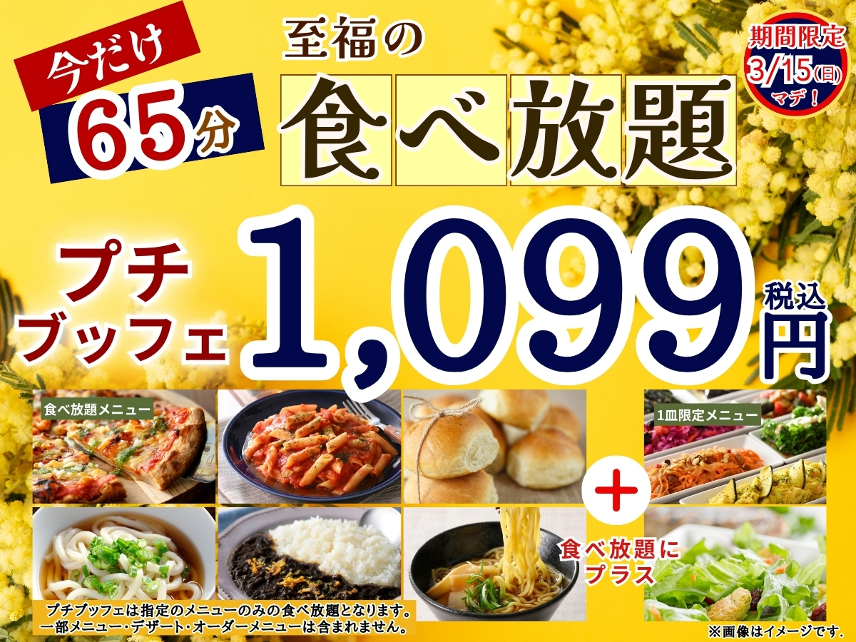 【コスパ最強!!1,099円で至福の65分食べ放題!!】3/15迄!‟ニラックスブッフェ”で人気の45分の食べ放題コース『プチブッフェ』を『20分』延長!充実の食べ放題を思う存分お楽しみください!